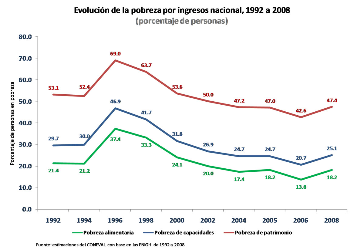 Entre 2006 y 2008, el porcentaje de personas en condición de pobreza de patrimonio en el país se incrementó de 42.6% a 47.4% (de 44.7 a 50.6 millones de personas).