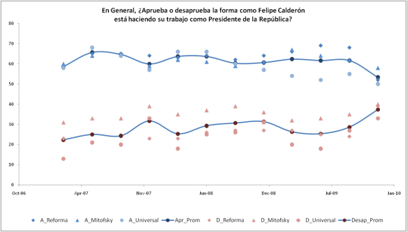 Este es el poll of polls de aprobación presidencial de Felipe Calderón de 2007 a 2009, incluyendo Reforma, Universal, consulta Mitofsky y un promedio. Agradezco la ayuda de Carlos Martínez en la preparación de esta gráfica.
