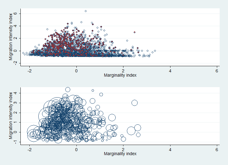 La Figura 2 ilustra el mismo punto de manera alternativa. El panel superior es un diagrama de dispersión (scatterplot) del índice contínuo marginación (2005) vs. intensidad migratoria (2002). Los puntos rojos denotan a municipios beneficiarios del programa 3×1 en ese año y los puntos azules son el resto de los municipios. El diagrama ilustra la misma relación no lineal de los boxplots anteriores. Como el índice de marginación está estandarizado (tiene media 0 y desviación estándar 1), puede decirse que la mayoría de los municipios beneficiarios tienen marginación menor al promedio municipal.