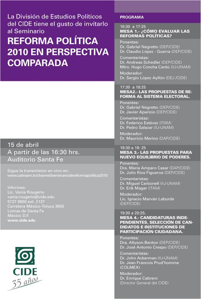 La División de Estudios Políticos del CIDE les extiende una cordial invitación al Seminario de Reforma Política 2010 en perspectiva comparada. El evento se llevará a cabo en el Auditorio Santa Fe del CIDE.