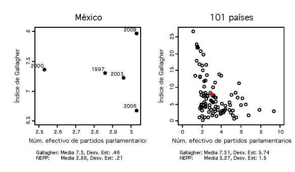 Normalmente, los sistemas mixtos de carácter mayoritario producen un menor número efectivo de partidos y mayores niveles de desproporcionalidad entre asientos y votos, mientras que los sistemas más proporcionales generan parlamentos con un mayor número efectivo de partidos y menores diferencias entre el porcentaje de votos y asientos obtenido por cada partido político. El panel izquierdo de la siguiente figura ilustra el número efectivo de partidos (NEP) y el índice de desproporcionalidad de Gallagher observado en las elecciones legislativas de México entre 1997 y 2009. Como se aprecia, el NEP promedio para México ha sido de 2.88 y el índice de Gallagher ha sido de 7.3.