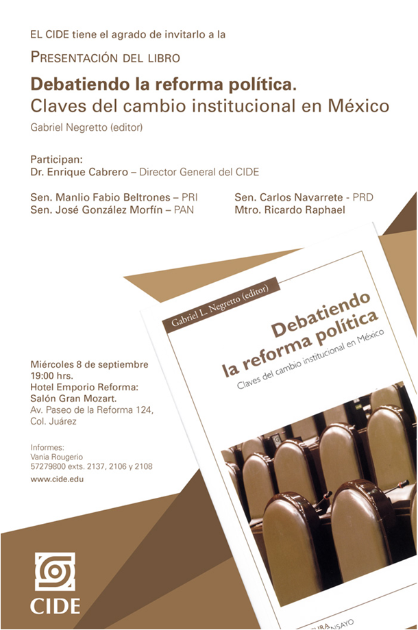 El próximo miércoles 8 de septiembre –en el Hotel Emporio Reforma, a las 19 horas– se presentará el volumen colectivo “Debatiendo la Reforma Política: claves del cambio institucional en México“, editado por Gabriel Negretto con la colaboración de: Javier Aparicio, Javier Márquez, María Amparo Casar, Julio Ríos-Figueroa, Allyson Benton, José Antonio Crespo y Claudio López-Guerra. La presentación se llevará al cabo por los Senadores manlio Fabio Beltrones, Carlos Navarrete y José González Morfín, así como por el Mtro. Ricardo Raphael.