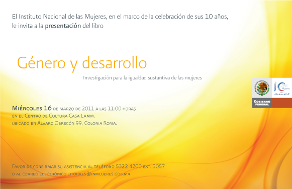 Este miércoles 16 de marzo, a las 11am en Casa Lamm, se presentará el libro Género y Desarrollo: investigación para la igualdad sustantiva de las mujeres, editado por el Instituto Nacional de las Mujeres. El volumen contiene una serie de estudios con enfoque de género apoyados por el Instituto, incluyendo el análisis de la cuotas de género en la elección federal 2009 que realizamos Joy Langston y un servidor. El libro electrónico está disponible aquí.