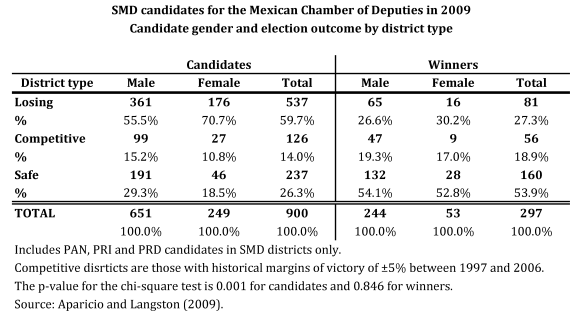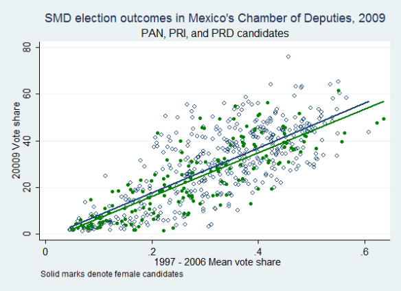 El fin de semana pasado, Joy Langston y yo presentamos un artículo en MPSA: “Gender quotas are not enough: How background experience and campaigning affect electoral outcomes“. El artículo combina evidencia estadística con entrevistas a profundidad a un conjunto de candidatos y candidatas a Diputado Federal de mayoría relativa en 2009. Tres objetivos clave del artículo son: