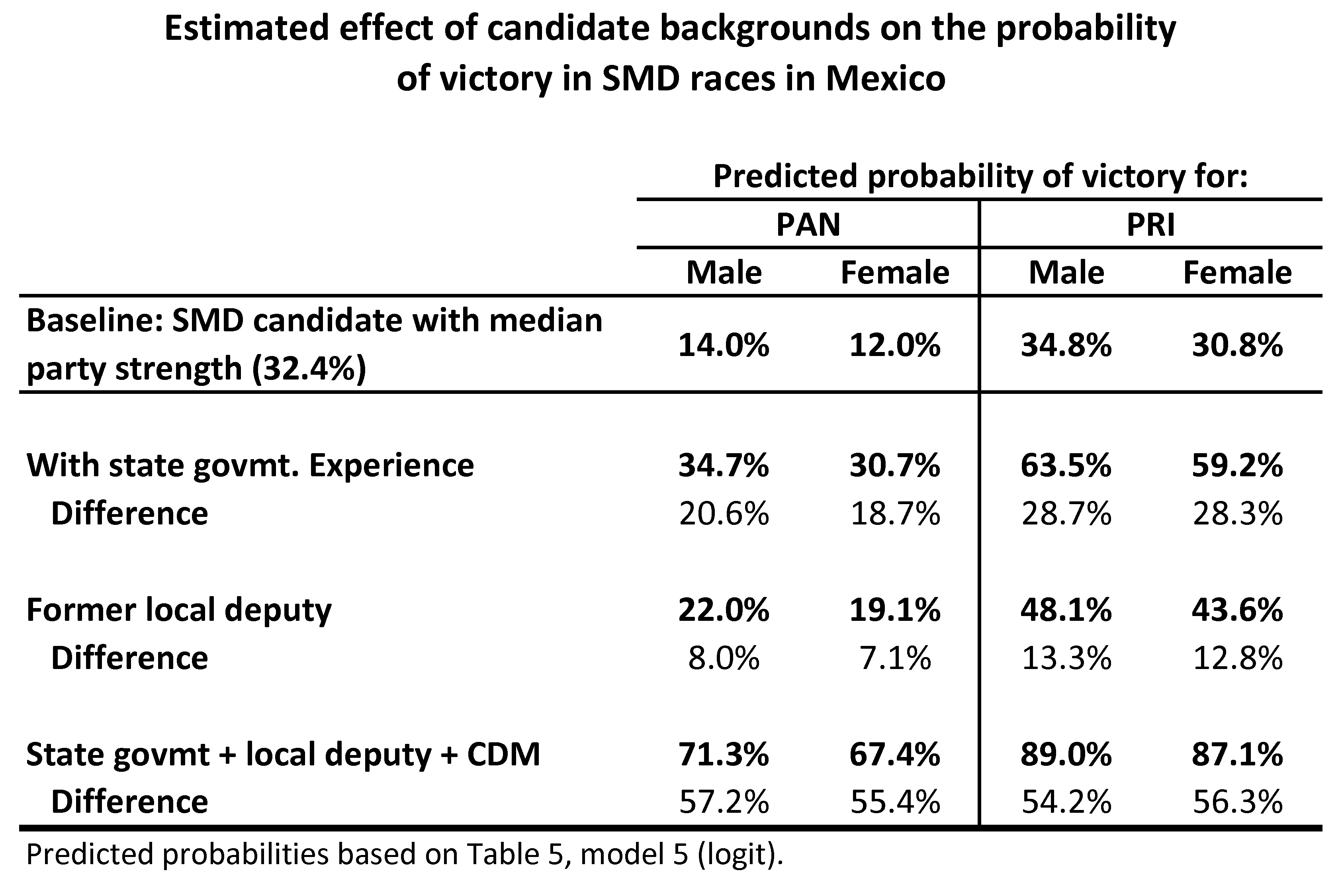 3. Estimar el efecto de la experiencia previa de cada candidato(a) en los resultados electorales y en las probabilidades de triunfo. La tabla siguiente presenta algunas estimaciones con base en modelos logit. Una candidata panista con poca experiencia, en un distrito donde el PAN históricamente ha tenido 32% de votos, sólo tiene una probabilidad de 12% de ganar–pero si ésta candidata ha sido diputada local, sus probabilidades de victoria aumentan hasta 19%. Por otro lado, una candidata del PRI bajo condiciones similares tendría una probabilidad inicial de triunfo de 30.8%, misma que aumentaría hasta 43.6% si ella hubiera sido diputada local previamente. (Dar click en la imagen para ver mejor la tabla).
