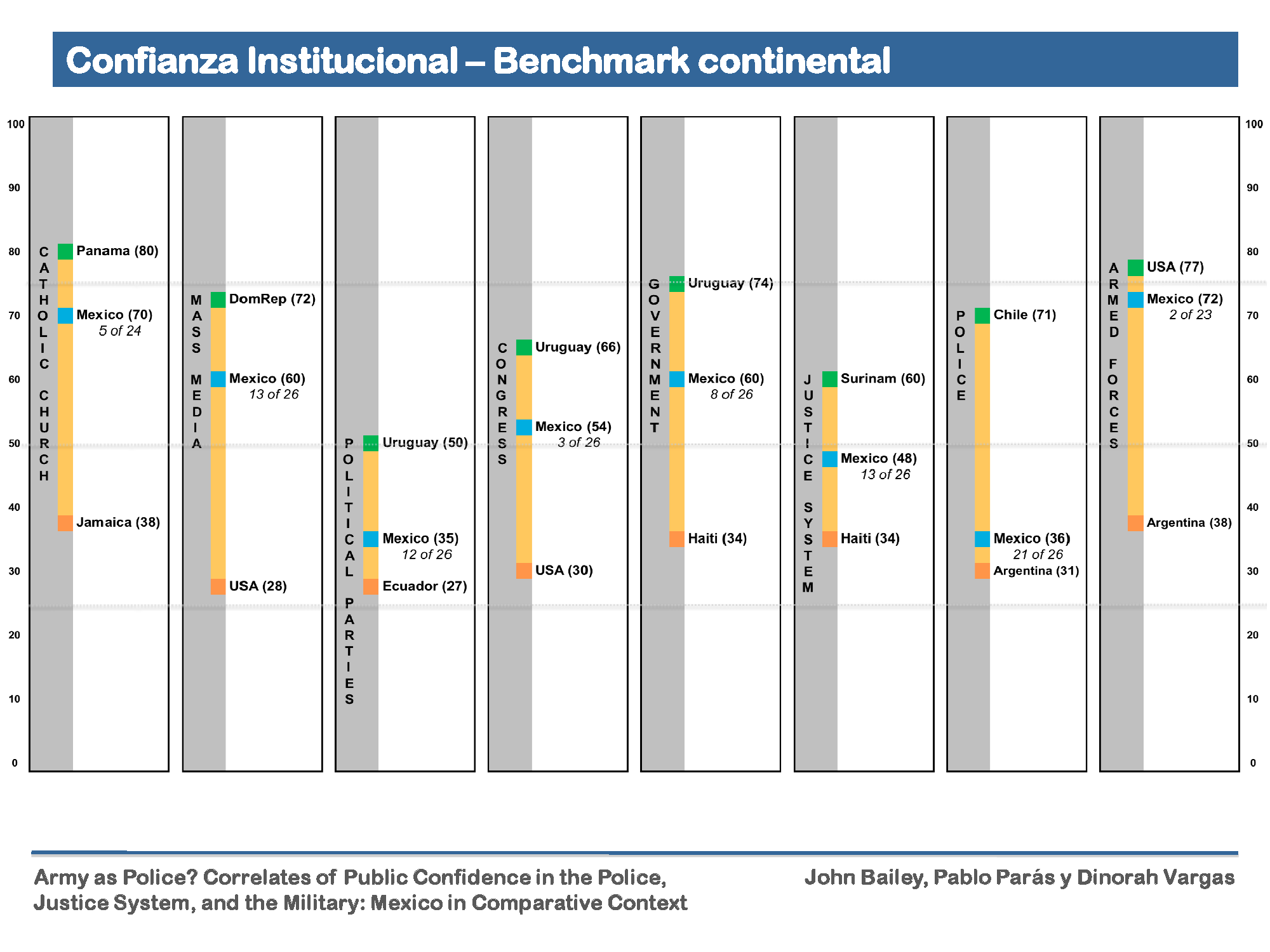 Según la más reciente encuesta del Latin American Public Opinion Project (LAPOP) para México (febrero 2010), una mayor proporción de mexicanos confían en el ejército (72%) que en la policía (36%), mientras que la confianza en el gobierno (60%) y el sistema judicial (48%) se ubica entre ambos extremos.
