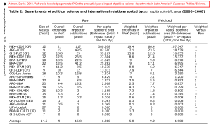 Abstract. Clear rules that encourage meritocracy, and that include the evaluation of scholarly productivity, are slowly and unevenly taking hold in academic life in Latin America. While some countries have official rankings of political science departments, others rely only on informal assessments. In a third set of countries, we cannot even consider the competition because the market is dominated by a state monopoly. This article provides a first, systematic study of scientific productivity and concomitant impact in more than twenty departments of Political Science and International Relations in the region. I show that scholars’ productivity is intimately related to where they pursued graduate studies, what subfield of research they work on, and the explicit adoption of rules that encourage meritocracy and academic careerism.