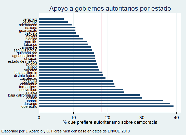 Y estas son las frecuencias por estado de quienes prefieren un gobierno autoritario (la línea roja denota la media nacional de 18%):