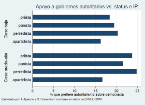 La predisposición autoritaria, por así decirlo, también varía de acuerdo a la identidad partidista de los encuestados (“¿simpatiza mucho o algo con…?”), y su situación económica (el encuestador evaluó el tipo de hogar):