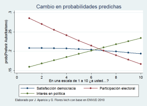 Por último, con base en una regresión multinomial logística podemos estimar el efecto de otras actitudes políticas en la probabilidad predicha de preferir el autoritarismo:Esta gráfica indica que la gente que más se interesa en política tiene una mayor probabilidad de preferir el autoritarismo, mientras que los que más participan en elecciones (whatever that means) lo son menos. Destaca que la satisfacción con la democracia en el país no tiene un efecto muy pronunciado en la predisposición autoritaria entre los encuestados.