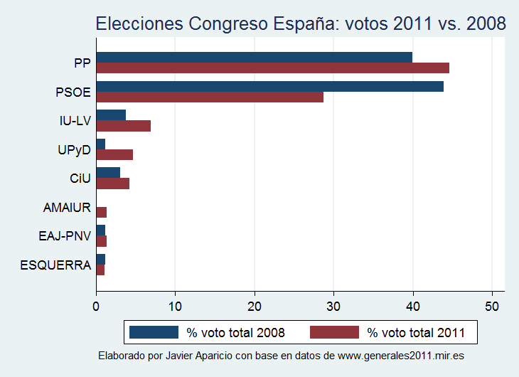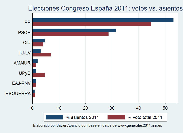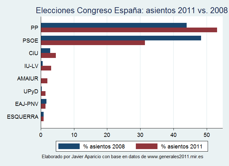 Entre 2008 y 2011 el PP aumentó su fuerza electoral de 39.9 a 44.6% del voto total, pero con ello su bancada pasó de 44 a 53.14% de los asientos del Congreso. Es decir, con poco menos de 5 puntos de aumento en preferencias, el PP consiguió más de 8 puntos porcentuales en los asientos. Por otro lado, el voto del PSOE pasó de 43.9 a 28.7% del total, y con ello su bancada cayó de 48.3 a 31.4% de los asientos. Cabe resaltar que no todos los votos que perdió el PSOE se fueron al PP, sino a partidos pequeños.