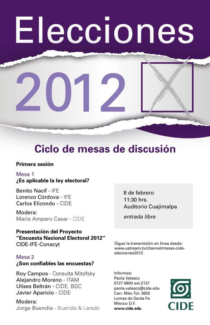 El miércoles 8 de febrero de 2012, a las 11:30hrs, se realizará la primera “Mesa de discusión sobre Elecciones 2012” en el Auditorio Cuajimalpa del CIDE.