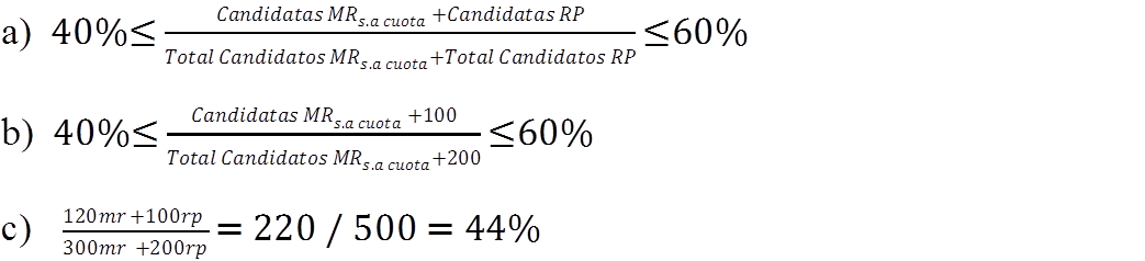 - En un caso extremo podrían nominarse 120 de 200 candidatas RP (60%) y sólo 80 de 300 candidatas MR (26.7%), resultando en 200 de 500 candidaturas para mujeres (40%).