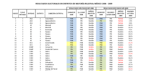 Aquí encontrarán un archivo de excel con los resultados electorales de los 300 distritos de mayoría relativa en 2006 y 2009. El archivo indica la cabecera distrital, quién fue el partido ganador, quién quedó en segundo lugar, si el distrito fue reñido o bastión, y cuál fue el margen de victoria de la elección federal más reciente. Aquí un detalle ilustrativo de los datos: