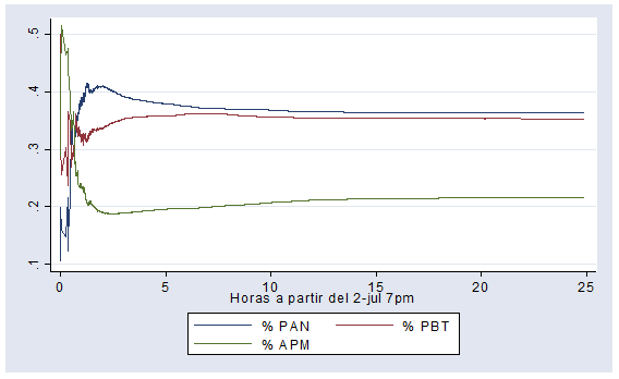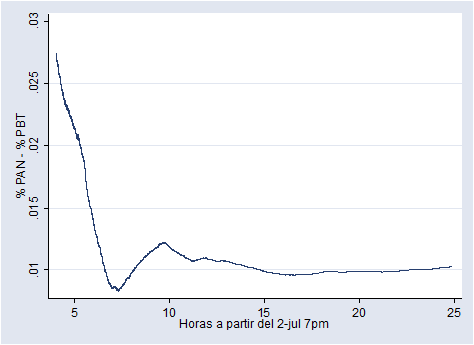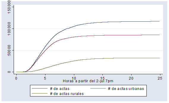 En el PREP 2006, FC inició con ventaja, pero esta se redujo conforme llegaron más y más casillas rurales. Sin embargo, su ventaja se estabilizó en alrededor de 1% en la madrugada del lunes 3 de julio. En 2006, hubo 70% de casillas urbanas y 30% no urbanas: Calderón ganó en las primeras y AMLO en las segundas. En las primeras 7 del PREP se procesaron casi todas las casillas urbanas, mientras que las casillas rurales se tardaron un poco más.