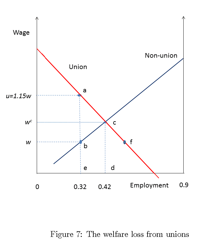 Con la introducción del sindicato en las empresas rojas, unos empleados ganaran mayores salarios pero los empleados azules recibirán menos. Esto no es una mera transferencia de excedentes: el triángulo acb denota la pérdida neta de bienestar social tras la introducción de sindicatos en la economía.