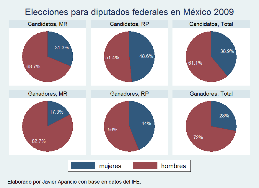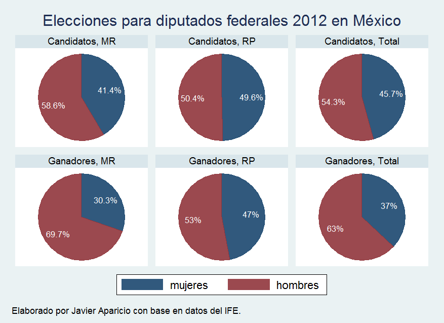 En 2009, 31% de las candidaturas de mayoría relativa fueron para mujeres (635 de 2028) y consiguieron 17.7% de los asientos de mayoría relativa de San Lázaro (53 de 300). En 2012, gracias a una importante sentencia del TEPJF, 41% de candidaturas fueron para mujeres y consiguieron 30% de los asientos de mayoría relativa (91 de 300). Al incluir 94 diputadas de representación proporcional, en total 185 mujeres llegaron al Congreso en 2012, 37% de la Cámara baja.