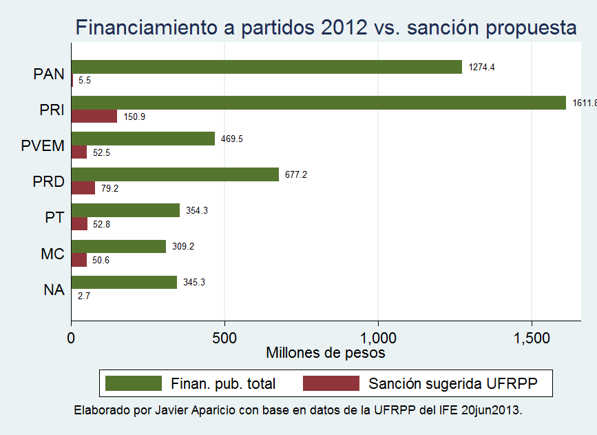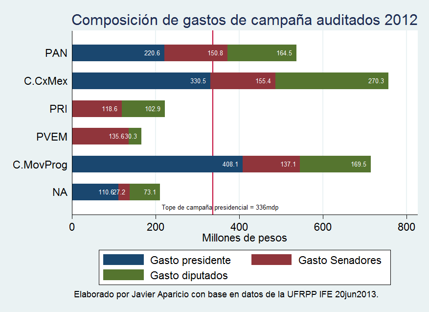 Los partidos políticos reciben financiamiento público para sus actividades ordinarias, para gastos de campaña y otras actividades. En 2012, los siete partidos políticos recibieron prerrogativas por 5,142 millones de pesos, 3,361 mdp para actividades ordinarias y 1,680 mdp para gastos de campaña. La siguiente gráfica ilustra las prerrogativas que recibió cada partido político y los ingresos combinados de las dos coaliciones: Compromiso por México (PRI-PVEM) y Movimiento Progresista (PRD-PT-MC). La coalición PRI-PVEM tuvo prerrogativas de 2,081 mdp y la del PRD-PT-MC de 1,340 mdp. Los partidos también reciben ingresos privados (de simpatizantes y militantes, etc.) pero aún no contamos con tal información.
