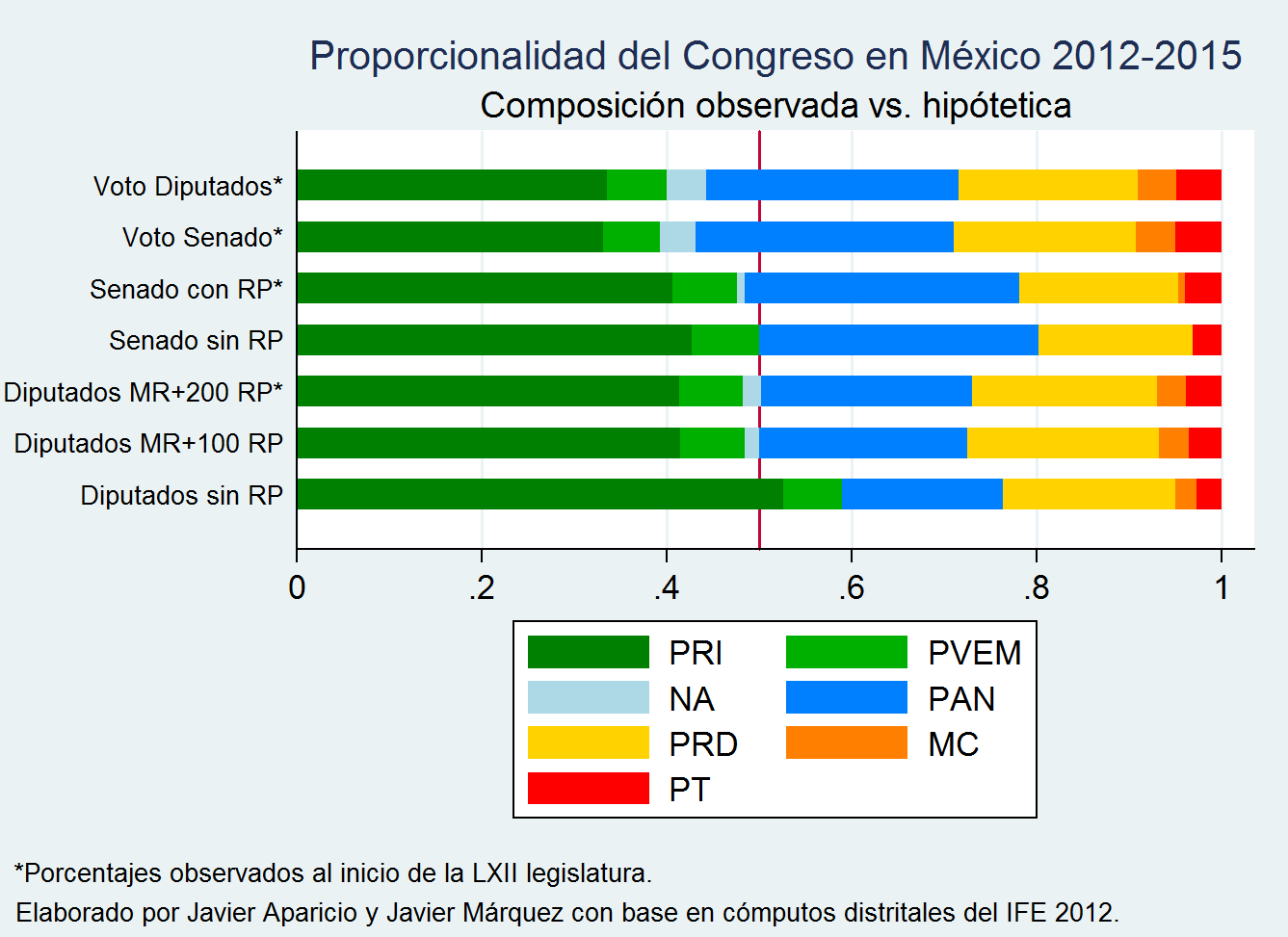 ¿Cómo luciría el Congreso en México si no existieran legisladores plurinominales? En julio de 2012 el PRI, PAN y PRD obtuvieron, respectivamente, 31.9, 25.9 y 18.4% de los votos válidos para diputados. Con tales votos obtuvieron 52.7, 17.3 y 18.7% de los distritos de mayoría relativa de modo que, sin plurinominales, el Congreso sobrerrepresentaría al PRI en más de 20 puntos porcentuales.