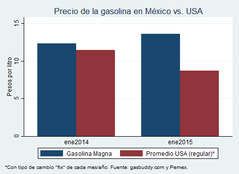 Al día de ayer, el precio promedio de la gasolina regular en los Estados Unidos fue de 2.22 dólares por galón, es decir, 59 centavos de dólar por litro. Al tipo de cambio de ayer (14.82 pesos por dólar), este precio promedio equivale a 8.69 pesos por litro. En las ciudades donde está más cara, como Los Ángeles o Nueva York, ésta no rebasa los 11 pesos por litro.