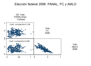 Esta gráfica ilustra el diagrama de dispersión (scatterplot) entre nuestras tres variables de interés, medidas a nivel distrital: 1) El diferencial de votos del PANAL (%voto diputados – %voto Campa), 2) el porcentaje de votos de Calderón, y 3) el porcentaje de votos de López Obrador. Como se aprecia, la correlación entre el diferencial de votos del PANAL y los votos de Calderón es ligeramente positiva… como también lo es la de López Obrador. Una correlación de 0.108 no permite rechazar la directiva Elba, pero la correlación positiva (y de magnitud similar, 0.096) con el voto de AMLO sí la contradice.
