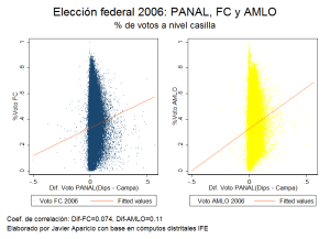 A pesar de esto, si recurrimos a los datos a nivel casilla, la inferencia es mucho más precisa pues se cuenta con datos de más de 130 mil casillas. La siguiente gráfica ilustra el diagrama de dispersión entre las mismas tres variables de interés, medidas a nivel casilla. Como se aprecia, la correlación entre el diferencial de votos del PANAL y los votos de Calderón es ligeramente positiva (0.074), pero la de López Obrador es aún mayor (0.11). En breve, si bien la primera correlación no permite rechazar la directiva Elba, la segunda correlación sí la contradice.