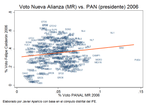 La siguiente gráfica analiza a mayor detalle la relación entre el porcentaje de votos del PANAL-diputados y los votos obtenidos por Felipe Calderón a nivel distrital (aquí el coeficiente de correlación es de 0.146). La gráfica incluye una línea de regresión simple en color naranja (R2 = 0.021).