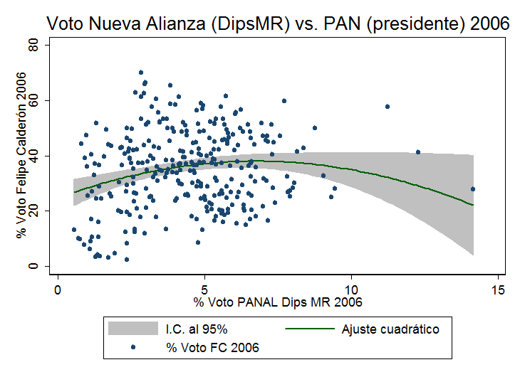 Antes de desgarrarse vestiduras con base en un regresión simple, consideren la misma gráfica pero con un ajuste cuadrático (R2 = .045). De acuerdo a esta regresión, si el PANAL alcanzaba más de 6.7% de votos para sus diputados, la relación con el voto de Calderón se vuelve negativa (y NL1 es un outlier). Una relación cóncava como ésta contradice la directiva Elba.